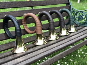 - Es&B Parforcehorn mit abschraubb. Becher und zusätzlichen Hirschnappaleder dkl. braun
