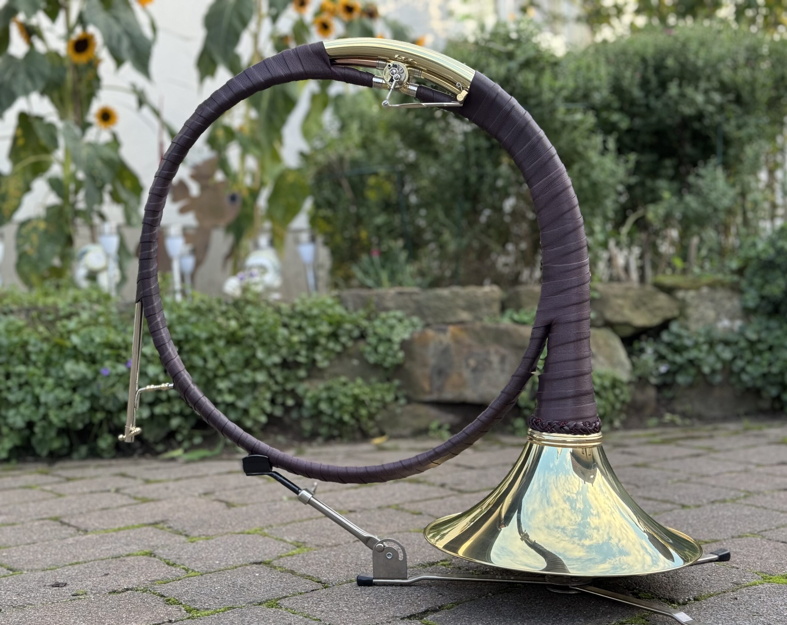 Goldmessing lackiert, B-Stimmung, mit Stimmzug (Flügelhornzapfen), schwarzer Kunstlederumwicklung,